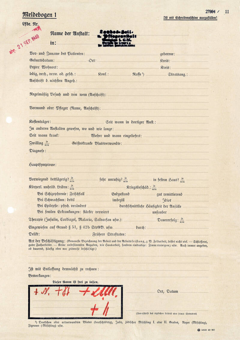 Nach Eingang der ausgefüllten Meldebögen in der »Euthanasie«-Zentrale wurden diese kopiert und die Kopien an insgesamt drei ärztliche Gutachter geschickt. Nach Durchsicht des Meldebogens trugen diese ihre Entscheidung in ein schwarz umrandetes Feld links unten auf dem Bogen ein.