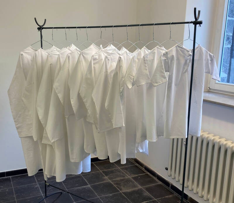 Das Material Leinen steht dabei für die Schutzbedürftigkeit des Menschen, denn es bekleidet uns von der Geburt bis zum Tod. Die Technik des Handdrucks ist die älteste und zugleich einfachste Drucktechnik, die jeder anwenden kann. Damit mache ich deutlich, dass es keiner ausgeklügelter Strategien oder besonderer Fähigkeiten bedarf, um die Menschenwürde anderer zu beschädigen und zu verletzen.