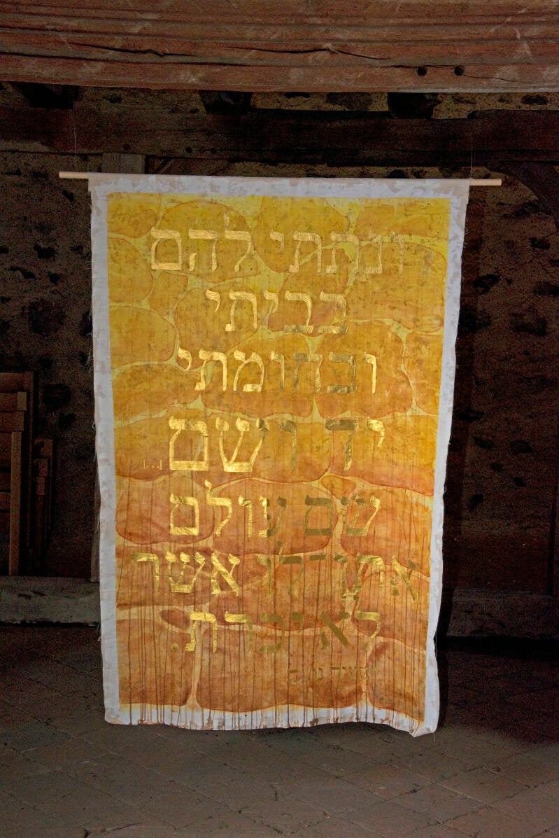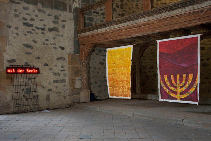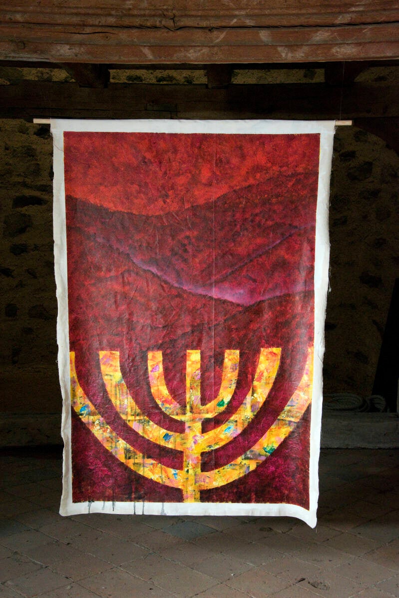 Das zweite Banner des Diptychons, „Schalom“, stellt den Bezug zur Gegenwart her und öffnet den Blick in eine hoffnungsvolle Zukunft: Die leidvolle Geschichte der Shoa mündet letztlich nicht in der Vernichtung des jüdischen Volkes, sondern in der Gründung des Staates Israel (14. Mai 1948), der die Menorah als Symbol in seinem Staatswappen trägt.