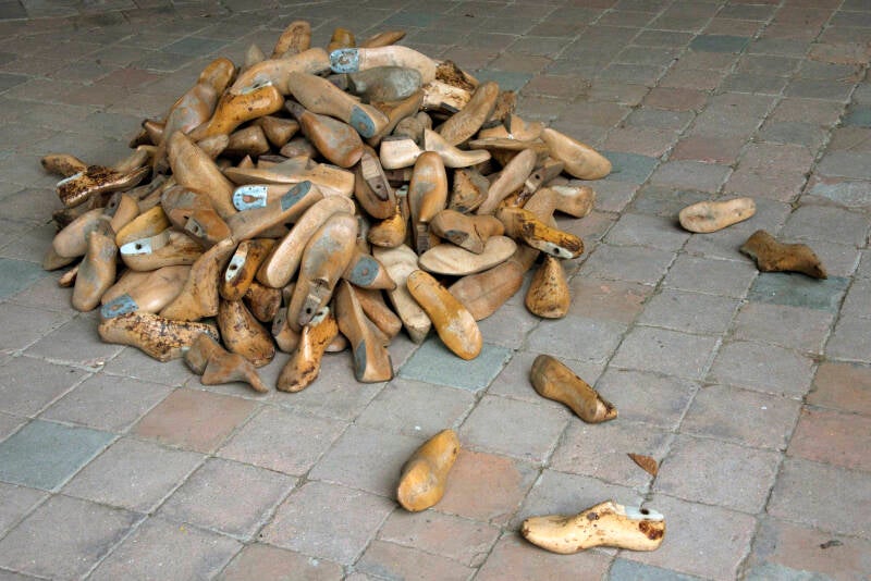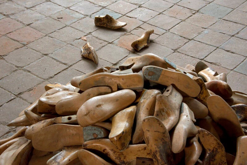 Ein Haufen alter hölzerner Schuhleisten, gefunden in einer zusammengefallenen Scheune in Hessen, erinnert schmerzhaft an die Anhäufungen letzter persönlicher und intimer Materialien der Menschen in Vernichtungslagern.