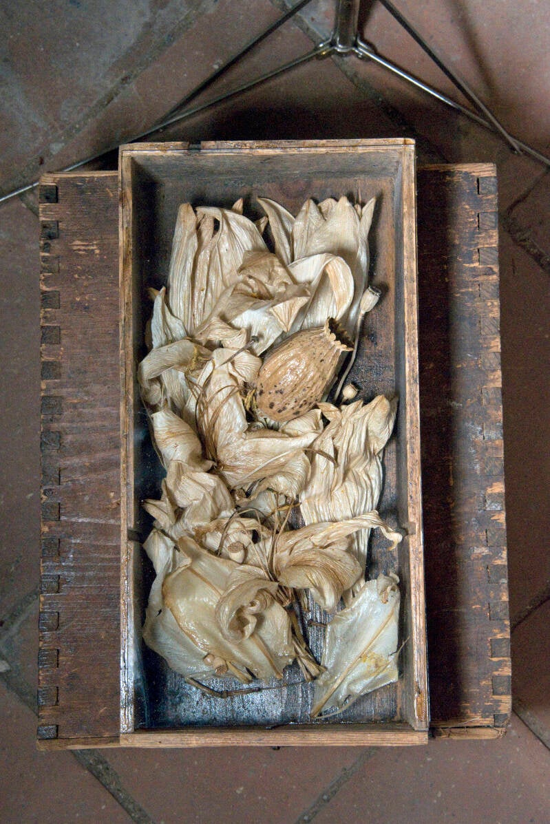 Feldbett weiße Laken weiße Lilien Mohnkapseln