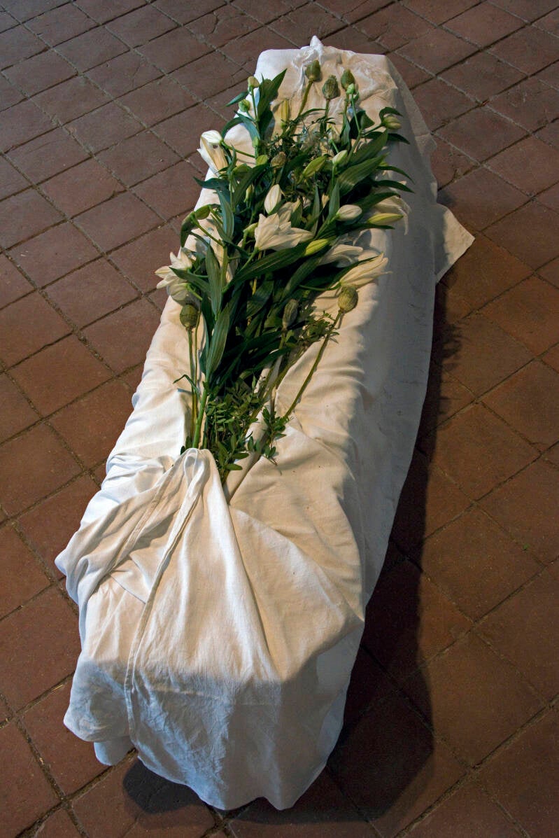 Auf dem Feldbett sind weiße Laken ausgebreitet, darauf liegen Lilien und Mohnkapseln. In vielen Kulturen werden Gestorbene zur Bestattung in ein Leinentuch gehüllt.