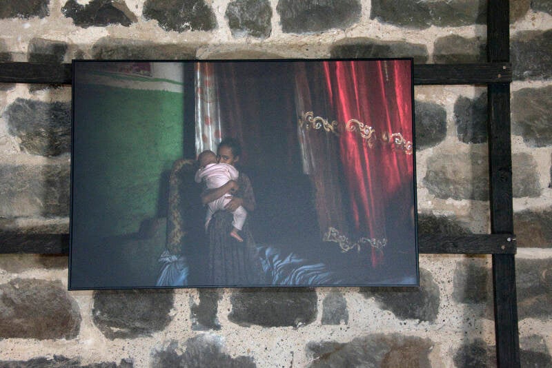 Die drei Digitaldrucke in den Leuchtkästen zeigen Flüchtlinge, welche durch ein Nachtsichtgerät – zum Teil mit Fadenkreuz – geortet werden.