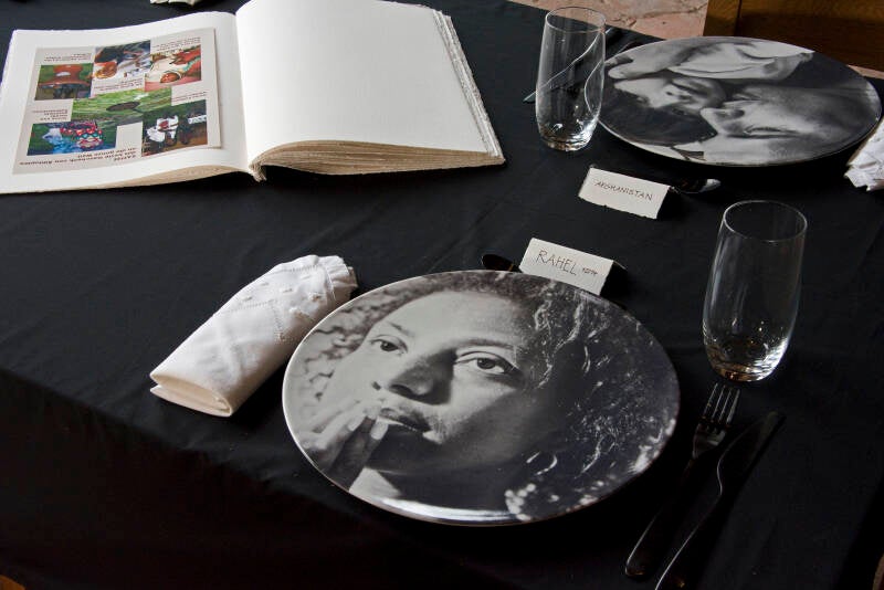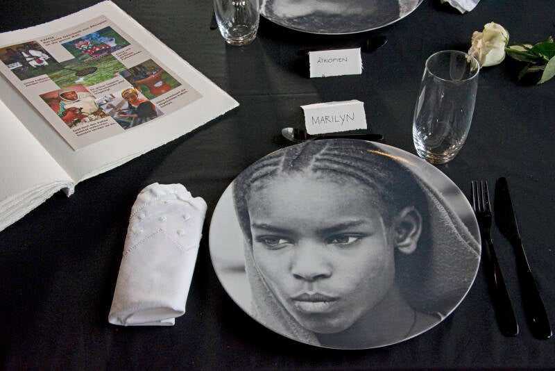 Ein langer Esstisch wird festlich mit schwarzem Tischtuch, schwarzem Besteck und Stoffservietten eingedeckt. Auf dem Tisch stehen sechs hochwertige Porzellanteller, 30 cm Durchmesser, einzeln bedruckt mit Porträtfotografie von Menschen, die symbolisch zum Essen und zu einem Gedankenaustausch einladen. Menschen aus anderen Kulturen, die mein Leben durch die persönlichen Begegnungen mit ihnen bereichert und inspiriert haben. Menschen, die mich bewegen, berühren und faszinieren.