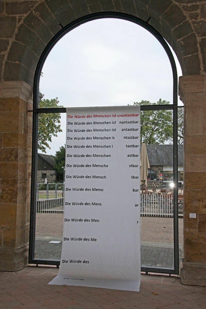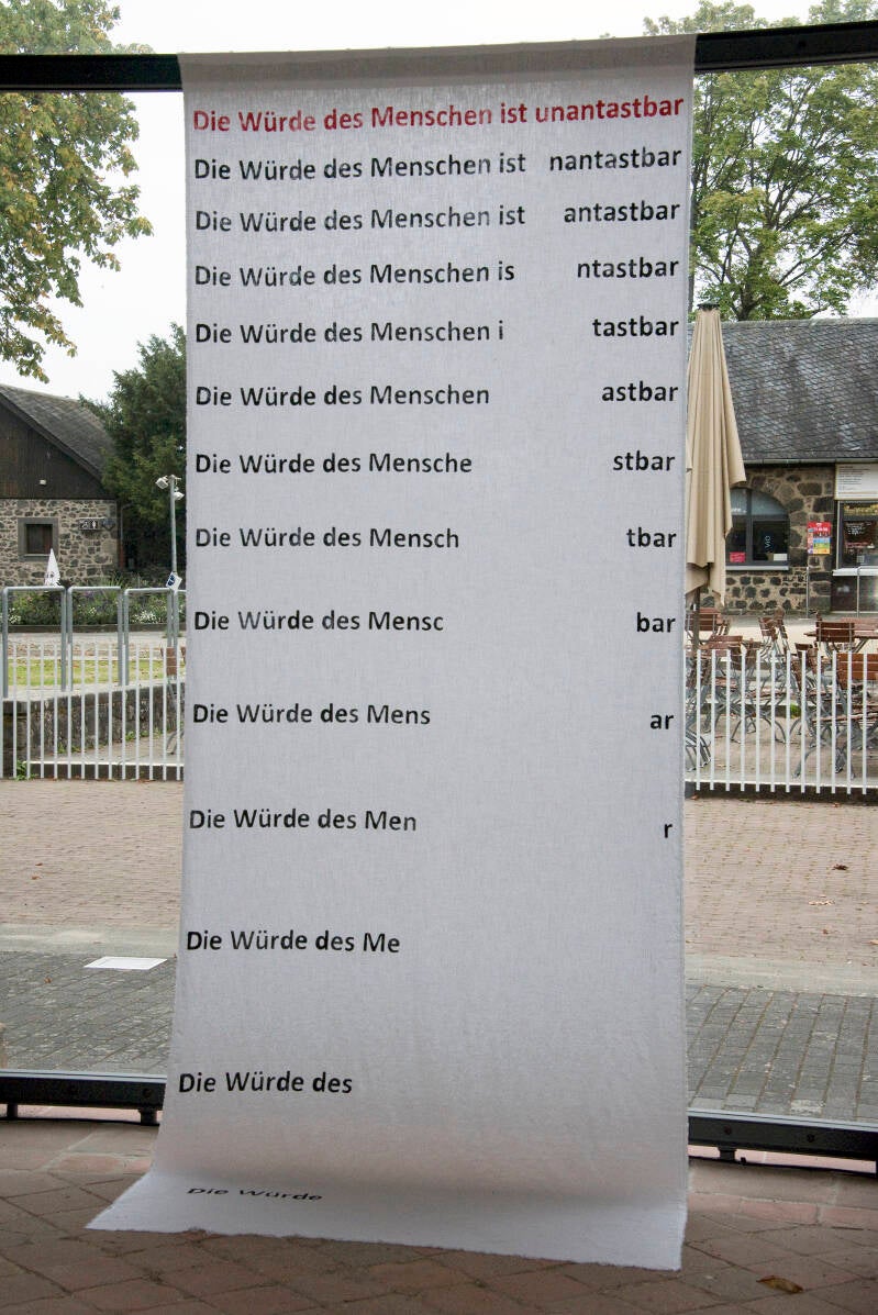 Mit der Entfernung des ersten Buchstabens beginnt ein Zerstörungsprozess, der bereits mit der Entfernung des zweiten Buchstabens zeigt, welch eine bedrohliche Entwicklung hier in Gang gesetzt wurde. Keine Gesellschaft ist gegen Angriffe auf die Menschenwürde immun, deshalb gilt es wachsam zu sein und den Anfängen zu wehren.