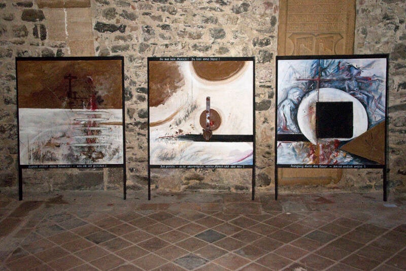 Die Gegenüberstellung der fünf Tafeln von „Biografie einer Hexe“ (1991 – 1993) und dem Triptychon „Ich habe gesehen … Ich sah … Dann ging er …“ (2020) soll die immerwährende und aktuelle „Entmenschlichung“ vermeintlich Andersartiger verdeutlichen.