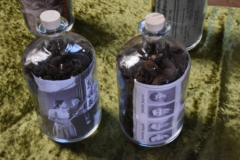 mit Kohlezeichnung, H130 x B. 100 cm, 12 Apothekergläser mit Ausdrucken von Dokumenten aus der NS-Zeit und Bucheckern gefüllt, Tischaufbau mit Pannesamt-Stoff bedeckt, Nierenschale mit Skalpell, Scheren, mit Draht umschlossen, 12 Klemmbretter mit Ausdrucken von persönlichen Dokumenten.